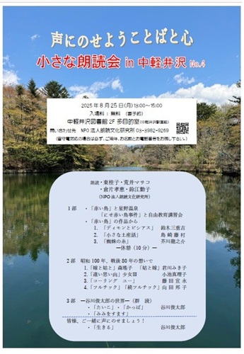 「小さな朗読会」IN中軽井沢 No.4 に参加して 北田敬子 日本中で記録破りの猛暑が続く中、信州軽井沢は別天地と言えるほど清涼な風と光に満ちている。東京方面のみならず地元軽井沢からの参加者も得て、会場は満席となった。 プログラムの1部では、先ず大正時代に星野温泉で無銭飲食者が起こした「にせ赤い鳥事件」の顛末に始まり、芸術教育夏季講習会のあり様が語られた。『赤い鳥』の作品から鈴木三重吉による「ディモンとピシアス」の友情物語を倉片が、島崎藤村の「小さな土産話」三作を東が、そして芥川龍之介の「蜘蛛の糸」を鈴江が朗読した。それぞれ味わい深くしかもスリリングな物語に聴衆の集中力が高まっていく前半となった。 2部では「昭和100年、戦後80年の想いで」というくくりで森瑤子の「嫁と姑」、君川みさ子の「姑と嫁」という愉快且つ背筋の寒くなる二作を荒井が、青春の記憶を描く小池真理子作「遠い思い出」少女IIIを倉片が、そして別れた父と娘の再会を(ノスタルジックなアメリカ映画「バグダッドカフェ」で流れていた)音楽を蘇らせる筆致で描く藤田宜永作「コーリング ユー」を東がそれぞれ情感豊かに朗読した。末尾を飾ったのは半世紀前に書かれた向田邦子作「ツルチック」「続ツルチック」。(朗読鈴江。)このエッセイの最後に登場する谷川俊太郎の名が第3部への橋渡しとなった。 3部は―谷川俊太郎の世界―(群読)という趣向で東、倉片、鈴江が「たいこ」・「かっぱ」・「みみをすます」など音として体に響く詩を次々に読み上げた。いずれも熟練の朗読者たちならではのパフォーマンスであり、谷川作「生きる」が恒例・参加者全員による一人一行ずつの群読となって会は大団円を迎えた。 当日、日本語の語彙・韻律・文化的背景を存分に味わうことが出来たのは大きな喜びだった。いずれ異文化からの参加者も交えてこの会がさらに発展していくよう心から願っている。(文中敬称略) NPO法人 朗読文化研究所機関紙「声にのせようことばと心」 |