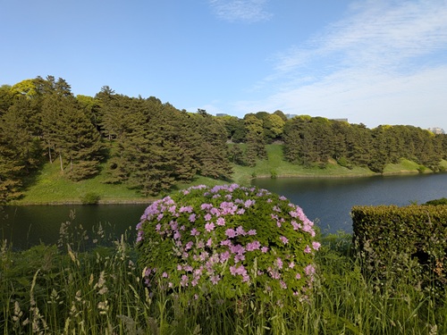 皇居お堀端 / The moat around the Imperial Palace, not far from the demonstrators, was calm and beautiful with azaleas blooming. |