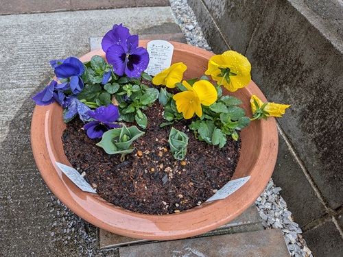 パンジーが囲むチューリップの芽―自宅の植木鉢 / a flower pot at home |