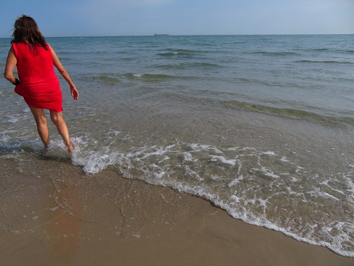 People in bashing suits bravely walked into the merged gulf streams. / 水着を着た人々は大胆にも両方の海流の混ざるところへ歩み出す。 |