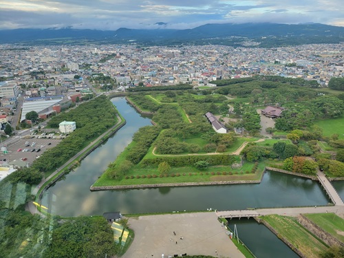 五稜郭タワーの展望室2階(地上90m)から見下ろす五稜郭公園。 |