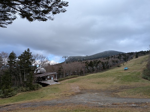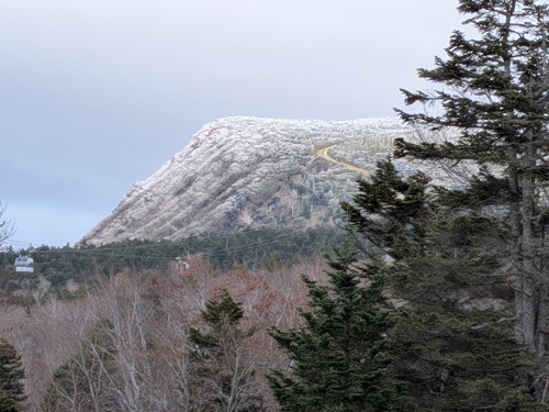 山腹から望むうっすら冠雪した頂上と、頂上へ向かうロープウェイ。 |