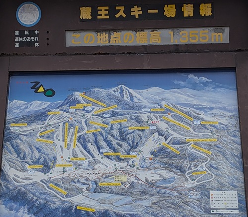 標高1355m地点にあるスキー場情報掲示板。シーズンには左上のサインが点灯する。 |