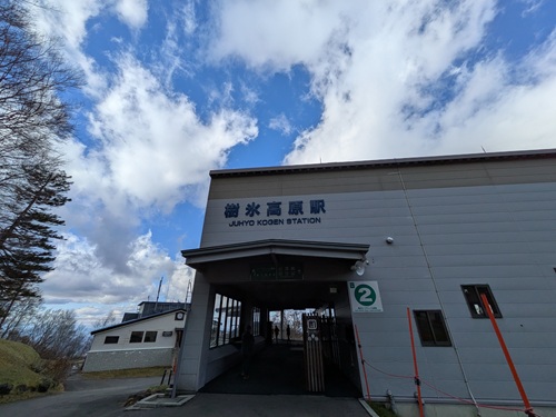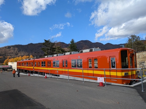山麓駅前に設置された東武電車8000系車両。スキーシーズンにはロープウェイを待つ人たちが中で暖を取ることが出来る配慮という。 |
