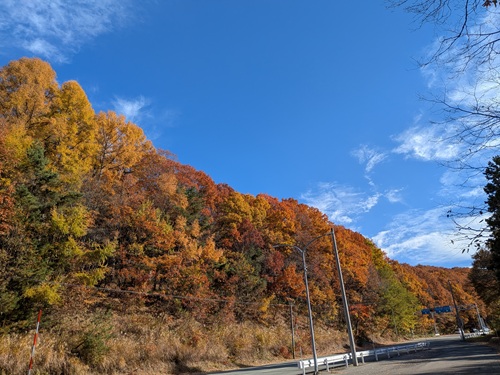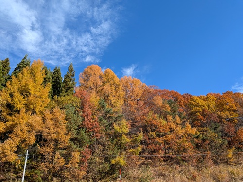 思わず車を止めて紅葉と黄葉のグラデーションに見惚れる。 |