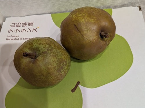 これでも4Lサイズのラ・フランス。5Lはあっという間に売り切れた。食べごろ迄熟れるのを待つようにという指示書が付いてきた。 |
