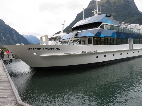 The crusing boat coming back to Milfordsound port. Mountains in a distance are covered with snow./