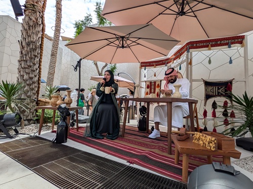 万博会場内、サウジアラビアのパビリオン前 / Staff demonstraiting the craftsmanship in front of the pavilion of Saudi Arabia at Osaka Kansai Expo 2025 |