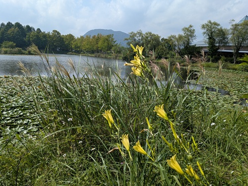 軽井沢矢ケ崎公園池の畔に揺れるユウスゲとススキの穂 / H. citrina var vespertine beside the lake in Yagasaki Park, Karuizawa