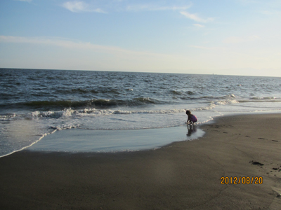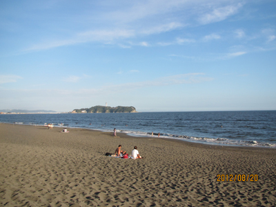 When I was an infant (maybe two or three years old) I was taken to a beach for the first time in my life. It was the sea with horrible waves splashing. A few days ago, we suddenly decided to go to a beach and finally came to the seaside with peaceful waves coming and going. I realized I was in the same beach, Tsujido Beach, after more than half a century. I kept watching the water feeling the mysterious coincidence. The sea sometimes gets furious and destructive. On that day it was so quiet. I could hardly feel satisfied nor get tired no matter how long I kept watching it. With a group of girls making merrily noise dancing and yelling, and surfers floating and standing on the waves in corners of my view, I was sitting on the sand absent- mindedly, just fascinated with the ocean in front of me. I guessed Enoshima Island and its beach next to Tsujido might be more crowded with visitors, but the beach we went was scarce with people now that the bathing season was gone. On the beach we're disturbed to remember old memories. It was a happy return to the beach. |